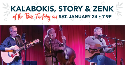 Come enjoy a genre-defying mix of familiar songs from the 60s, 70s and 80s, from Jim Kalabokis, Fred Story & Larry Zenk — the collaborative hosts of the Box Factory Wednesday Open Mic Nights. Known for their musicianship and harmony, the group can be found playing local wineries as well as in Chicago individually, as a duo, or as a trio in the Sand Rabbits. Sure to be a night to remember!