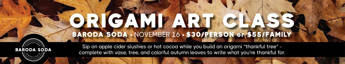 Join us for a special art class hosted by Cindy from Paper Lotus Studio. She'll be leading a cozy Thanksgiving craft session at Baroda Soda, where creativity and gratitude come together! Sip on apple cider slushies, hot cocoa or a fun milkshake while you fold and design your own Origami Thankful Tree — complete with an origami vase, tree, and colorful autumn leaves to write what you're thankful for.