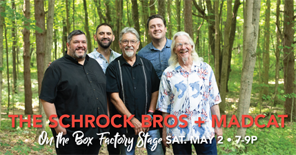 The Box Factory for the Arts, 1101 Broad St., presents The Schrock Bros Band and Madcat Ruth on Saturday, May 2, 7-9PM. With soulful lead vocals, family harmony, and solid musicianship, the Schrock Bros offer up original music peppered with a collection of nuggets from the Americana archives. They will be joined by Grammy Award-winning harmonica master Peter “Madcat” Ruth. This will be a night you won't want to miss!